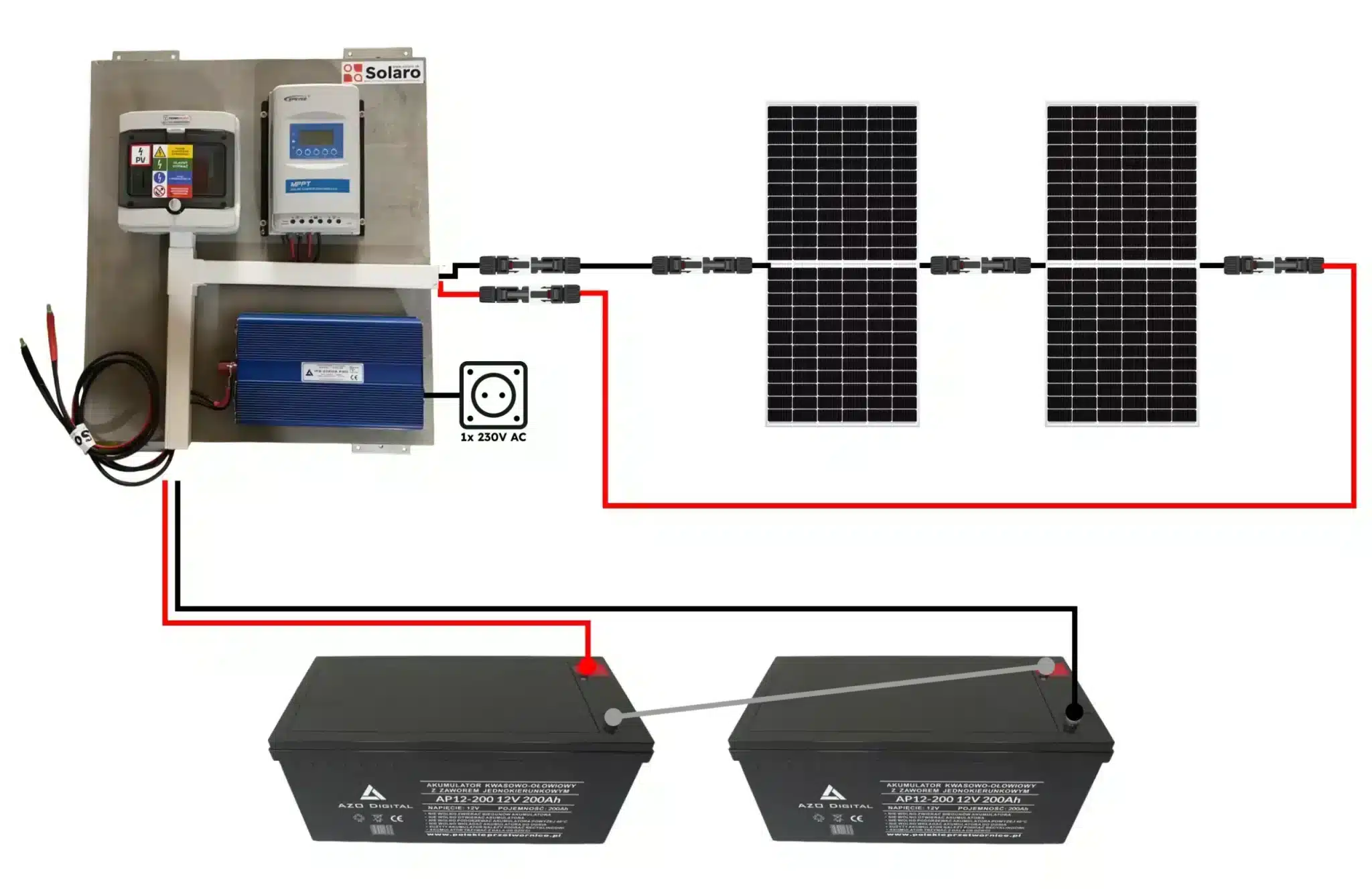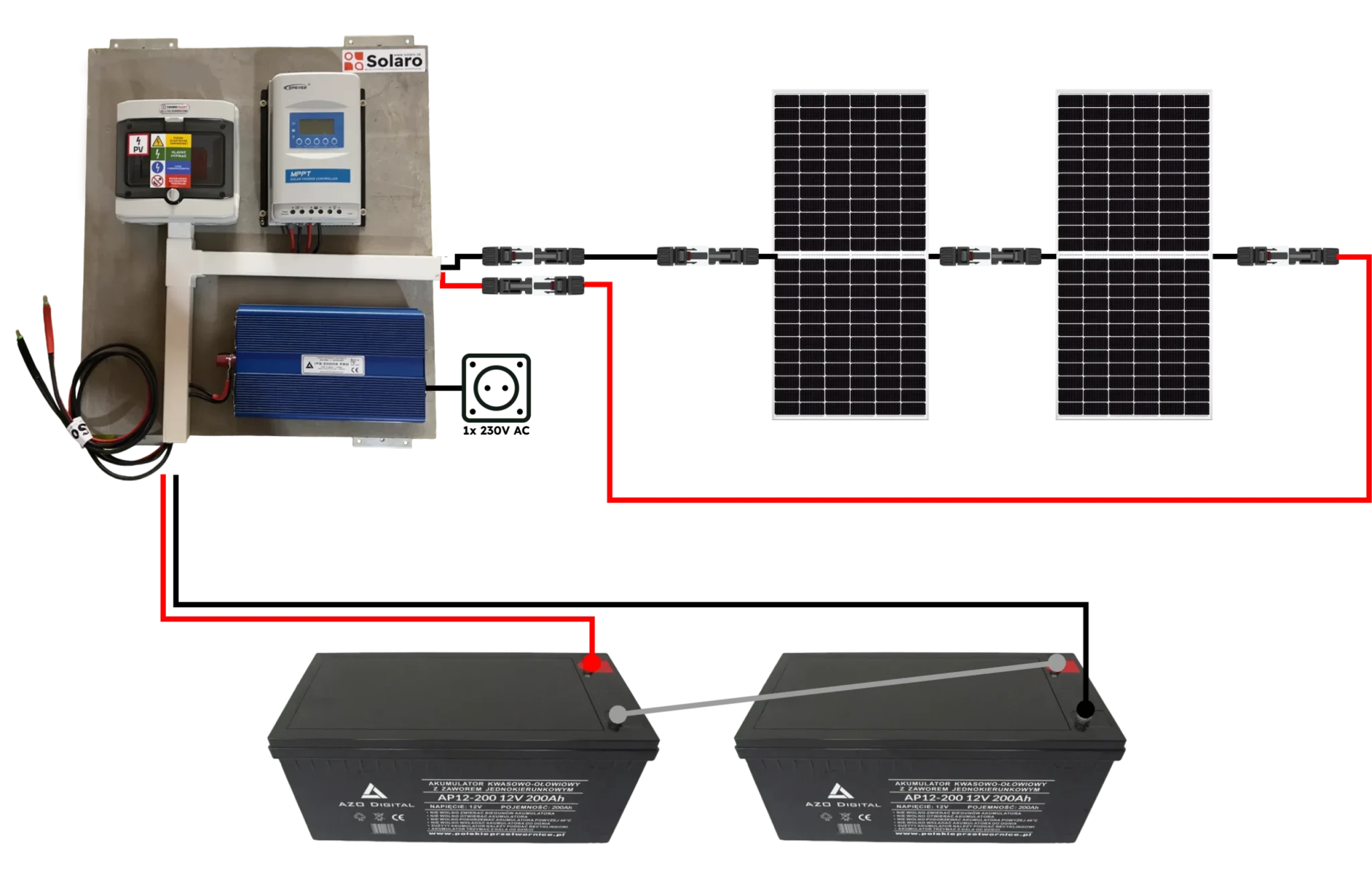 Rozvodná skriňa zapojená a pripravená na použitie. Obsahuje potrebné poistkové odpínače a kabeláž na pripojenie solárneho panelu a batérie. Spolu so systémom sú dodávané predĺžovacie káble 20m s predinštalovanými konektormi MC4 a káble potrebné na pripojenie batérií.