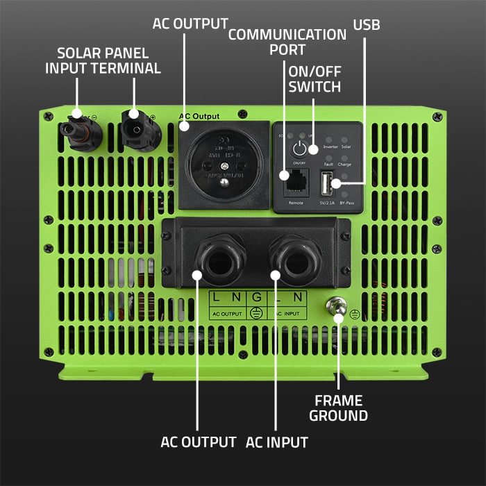 Kompaktný 3000 W solárny menič s čistou sínusovkou (rozbehový výkon až 6000W) kombinuje AC nabíjanie 40A, MPPT solárne nabíjanie 40A a automatické prepínanie zdroja (ATS). Ponúka režim UPS pre bezvýpadkové napájanie – pri výpadku siete sa okamžite prepne na batériu a zároveň ju dokáže nabíjať zo 230 V. K dispozícii je aj úsporný režim ECO. Menič umožňuje pripojenie solárnych panelov a efektívne využitie ich výkonu vďaka MPPT regulácii.