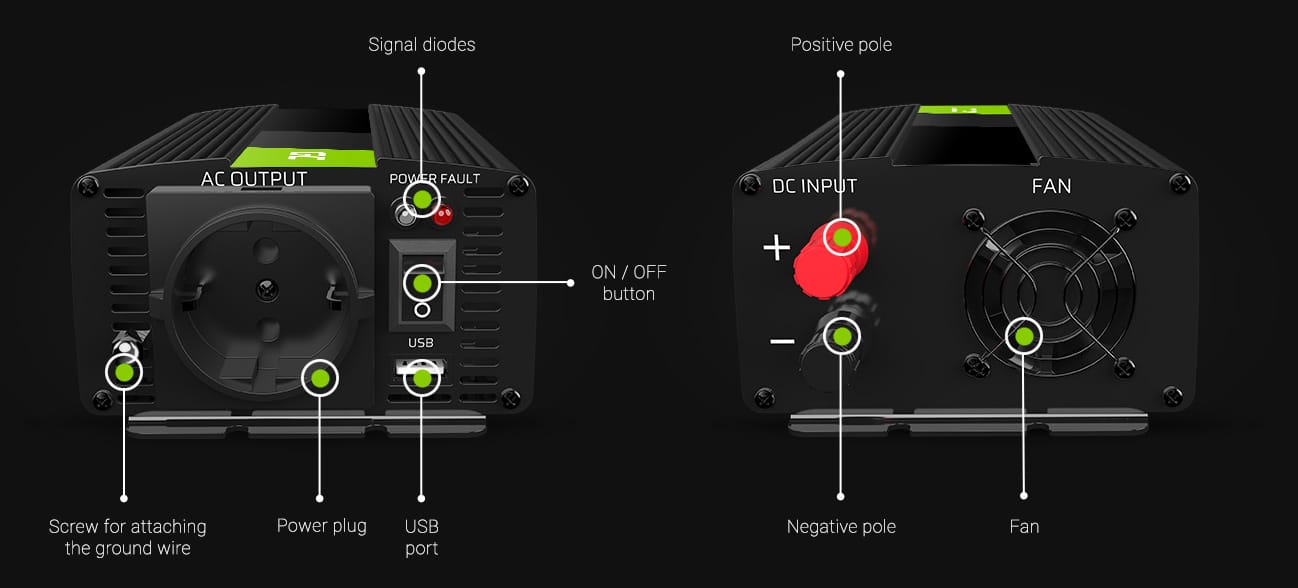 Zariadenie bolo navrhnuté pre najvyššie pohodlie pri používaní. Predná strana meniča je vybavená sieťovou zásuvkou prispôsobenou konektorom používaným v celej Európe a USB portom , vďaka ktorému môžeme nabíjať náš smartfón, čítačku elektronických kníh a akékoľvek iné zariadenie s možnosťou pripojenia cez USB port.