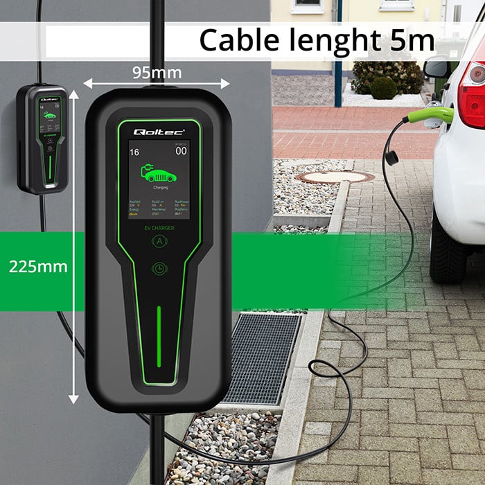 Mobilná 3-fázová nabíjačka na elektromobil (prenosný wallbox) Qoltec s konektorom Type 2 a 5-pin 32A zástrčkou umožňuje pohodlné a bezpečné nabíjanie doma aj na cestách. Podporuje 230 V (1-fázovo) aj 400 V (3-fázovo), má prehľadný LCD displej, nastaviteľný nabíjací prúd a funkciu oneskoreného štartu. Vďaka 5 m káblu, kompaktnému vyhotoveniu a odolnosti voči poveternostným vplyvom je vhodná do garáže aj na vonkajšie použitie, pričom bezpečnostné prvky zabezpečujú stabilnú prevádzku. Vrátane držiaka na stenu v balení.