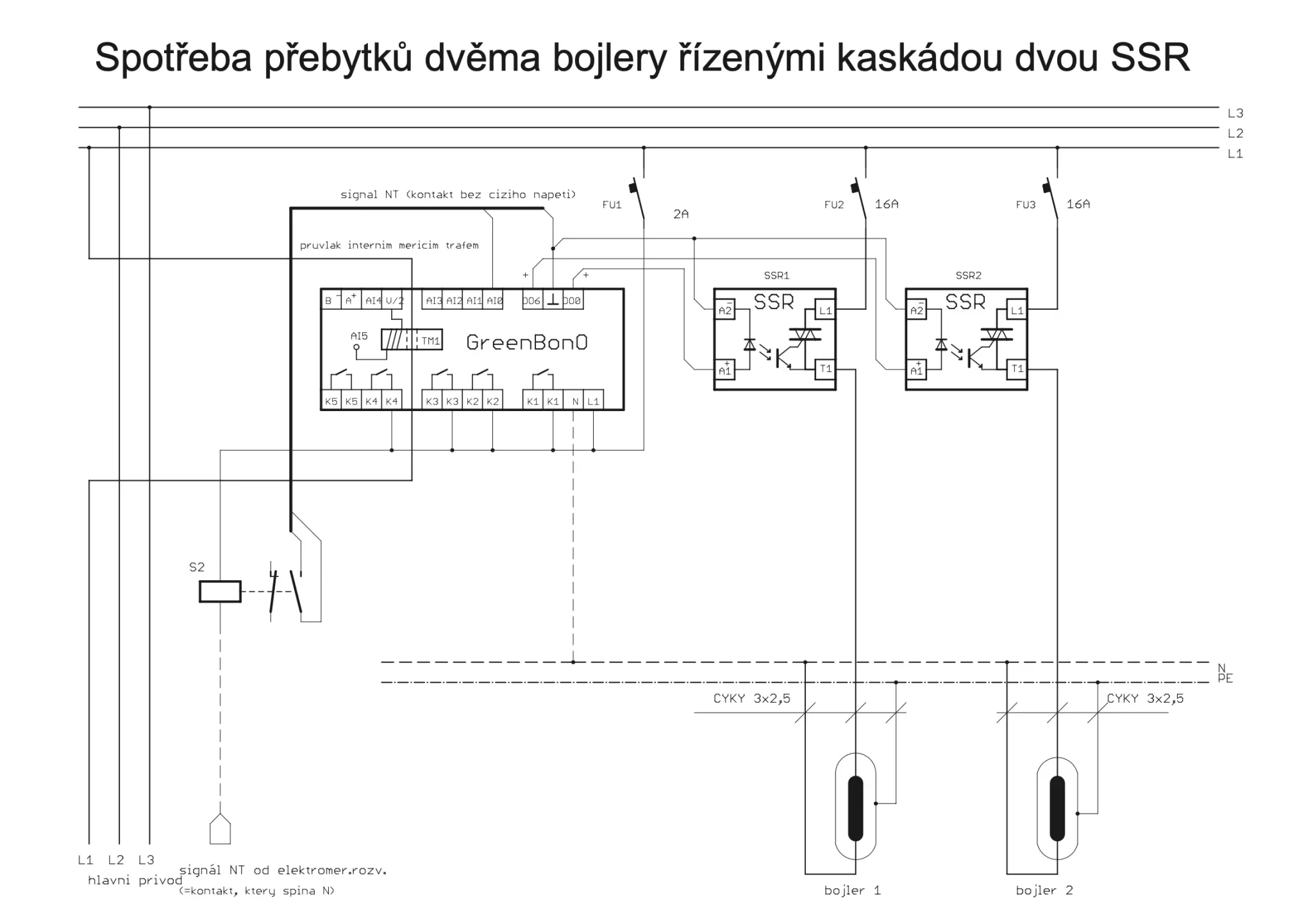| regulace spotřeby přebytků z FVE: | prozatím je v prvním stupni každé fáze plynulé řízení příkonu 0 ... 100% (v jednofázové verzi až kaskáda tří plynule řízených spotřebičů), výhledově bude v prvním stupni každé fáze kaskáda dvou plynule řízených spotřebičů, v jednofázovém provedení kaskáda až šesti plynule řízených spotřebičů v dalších stupních připínání neregulovaných spotřebičů se současnou regulací v prvním stupni |