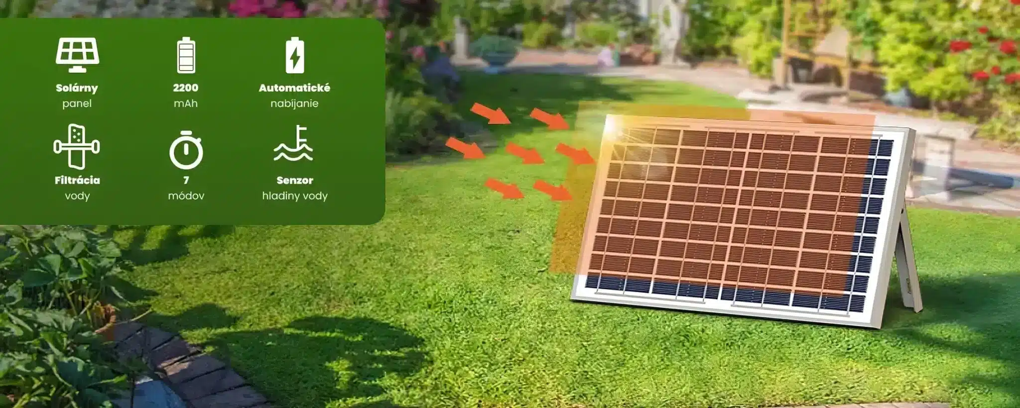 Automatické solárne zavlažovanie v prednastavenom objeme a časovom intervale.
