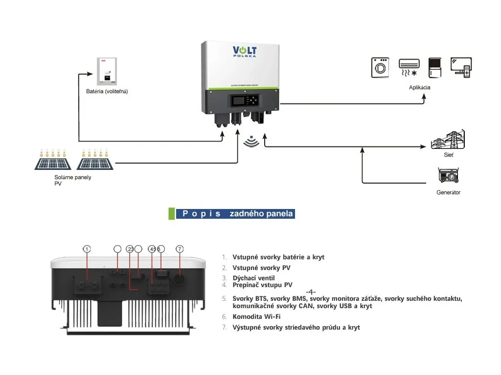 - Off-grid režim: V prípade výpadku siete alebo v lokalitách bez prístupu k elektrickej sieti menič prechádza do off-grid režimu. Energia zo solárnych panelov sa ukladá do akumulátorov a následne sa používa na napájanie pripojených zariadení, čím zabezpečuje nepretržitú dodávku energie.