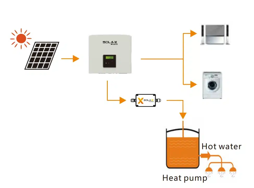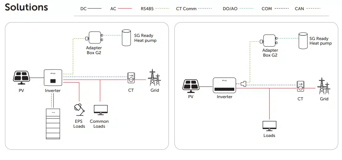 Adaptér Box G2 je regulátor tepelného čerpadla, ktorý umožňuje inteligentné využitie energie z fotovoltiky v systémoch SolaX. S meničom komunikuje cez RS485 a tepelné čerpadlo riadi buď cez suchý kontakt, alebo cez analógový výstup. Používateľ si vie nastaviť logiku tak, aby sa tepelné čerpadlo spúšťalo a regulovalo podľa prebytkov solárnej energie a podľa dostupnej kapacity batérie striedača, čím pomáha zvýšiť vlastnú spotrebu a znížiť odber zo siete.